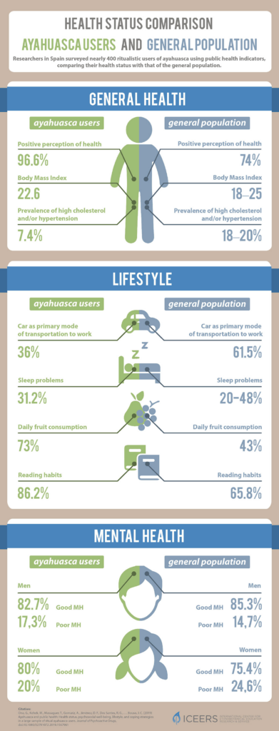 *Ona, G., Kohek, M., Massaguer, T.,… & Bouso, J.C. (2019). Ayahuasca and public health: health status, psychosocial well-being, lifestyle, and coping strategies in a large sample of ritual ayahuasca users. J Psychoactive Drugs, doi: 10.1080/02791072.2019.1567961