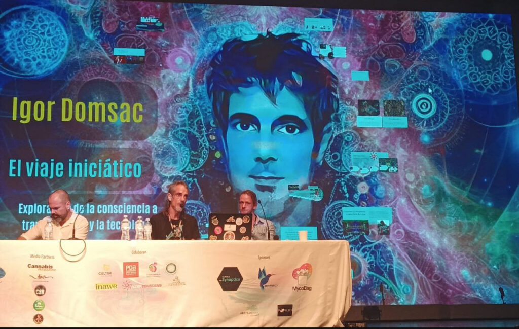 Igor Domsac took us on a journey through his creative career, marked by his attempt to translate the psychedelic experience into different artistic languages. His presentation culminated with the screening of “Psilocibes, lo percibes,” an immersive audiovisual piece developed with the help of various generative artificial intelligences. The result was a sensory journey that unfolded images, rhythms, and atmospheres evoking expanded states of consciousness, which integrated naturally into the exploratory spirit of the conference.